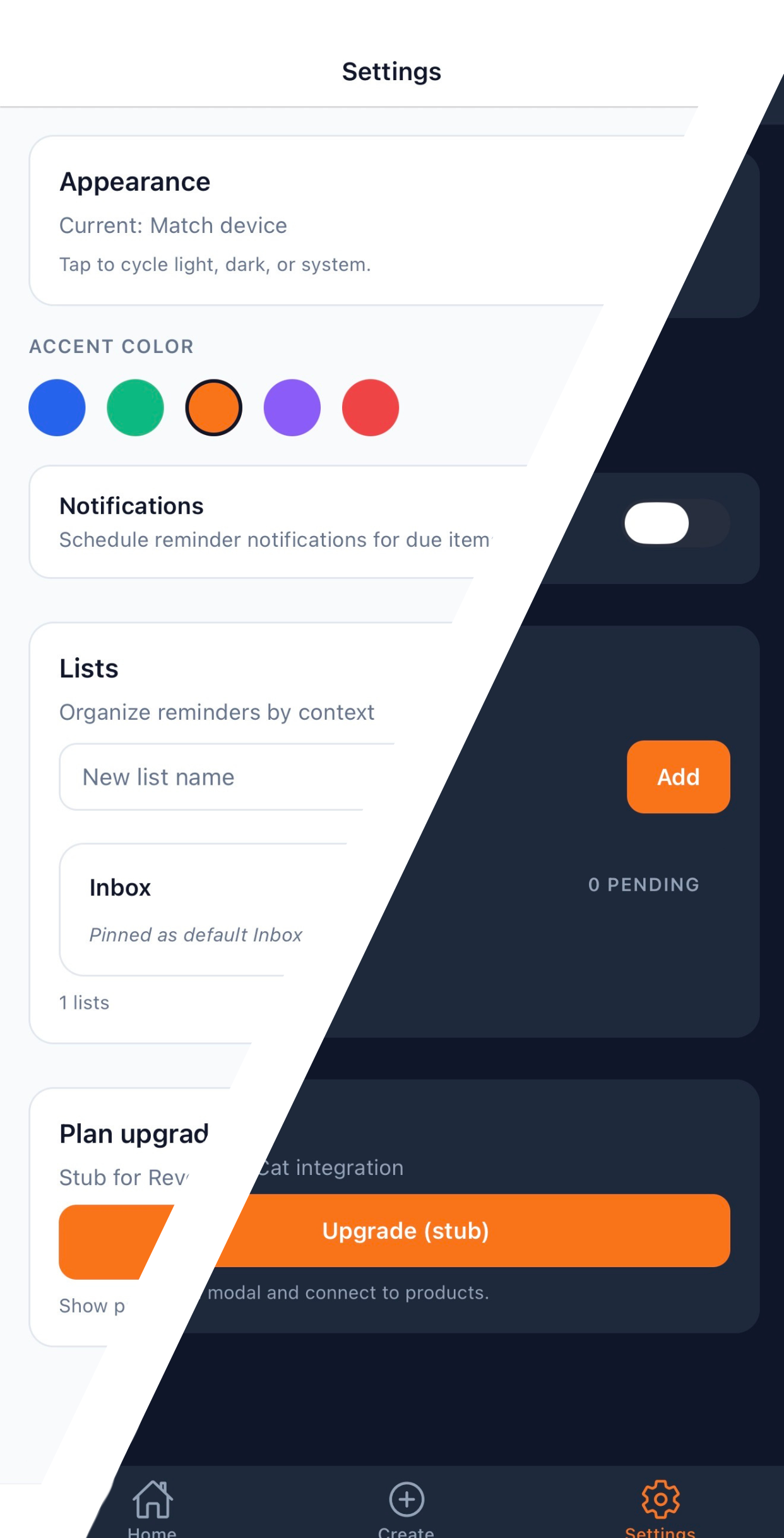 Under the hood you get strict TypeScript, reusable components, typed AsyncStorage stores, and a notifications layer wired for scheduled reminders. Settings include accent theming, list management, and a paywall stub so you can plug in monetization when you are ready. Customize the branding, connect your backend, and head to the store with confidence.